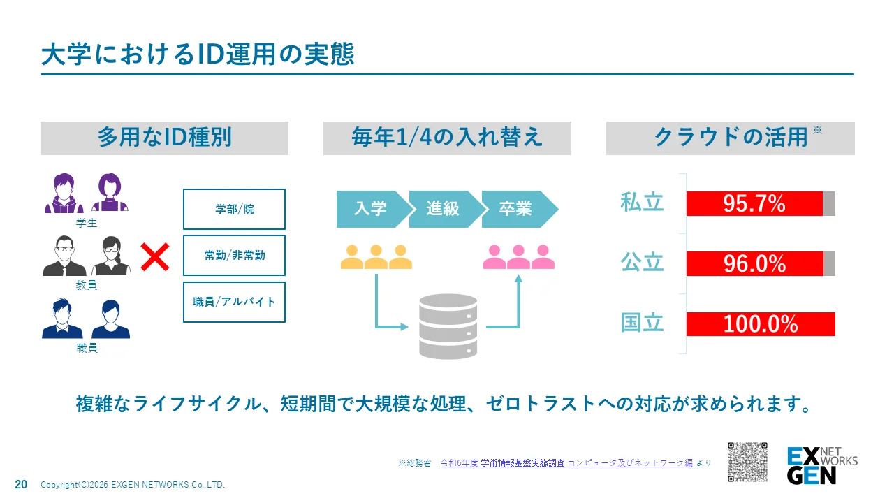 大学・研究機関では、学生や教職員など多様なID種別を扱う必要があるほか、在籍・所属情報に応じた複雑なライフサイクル管理が求められます。さらに、年度替わりの限られた期間に、入学・卒業・人事異動に伴う大量のアカウント発行や更新処理が発生する点も、大きな特徴です。このような環境においてゼロトラストを実装するためには、認証(IdP)だけ、あるいはID管理(IdM)だけ を個別に整備するのではなく、両者をセットで整備し、運用を標準化することが重要になります。