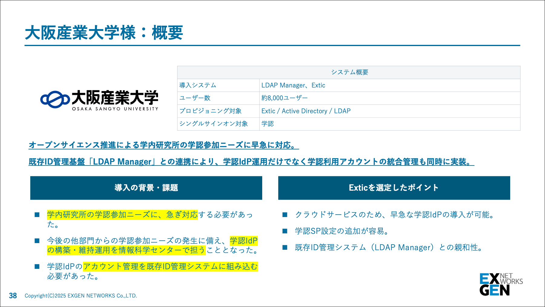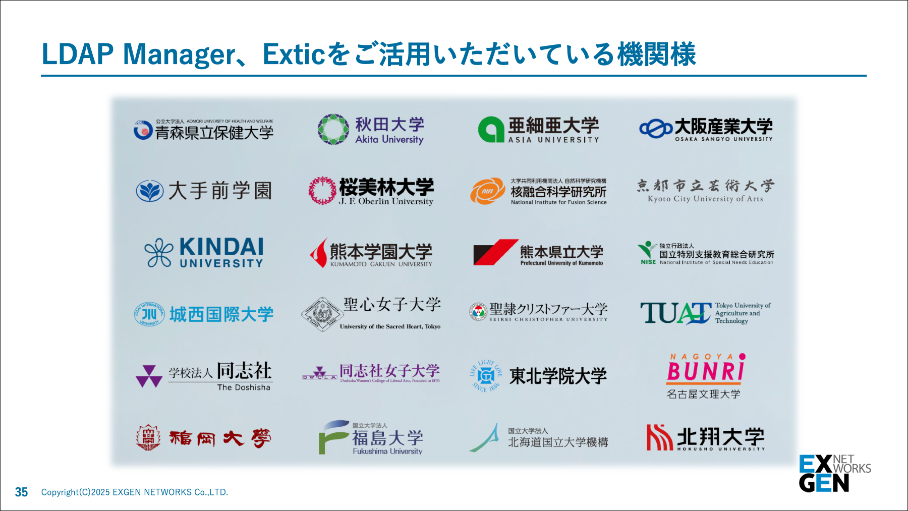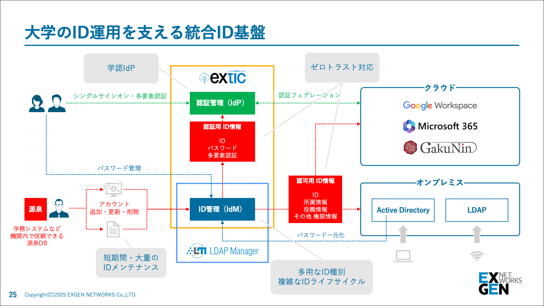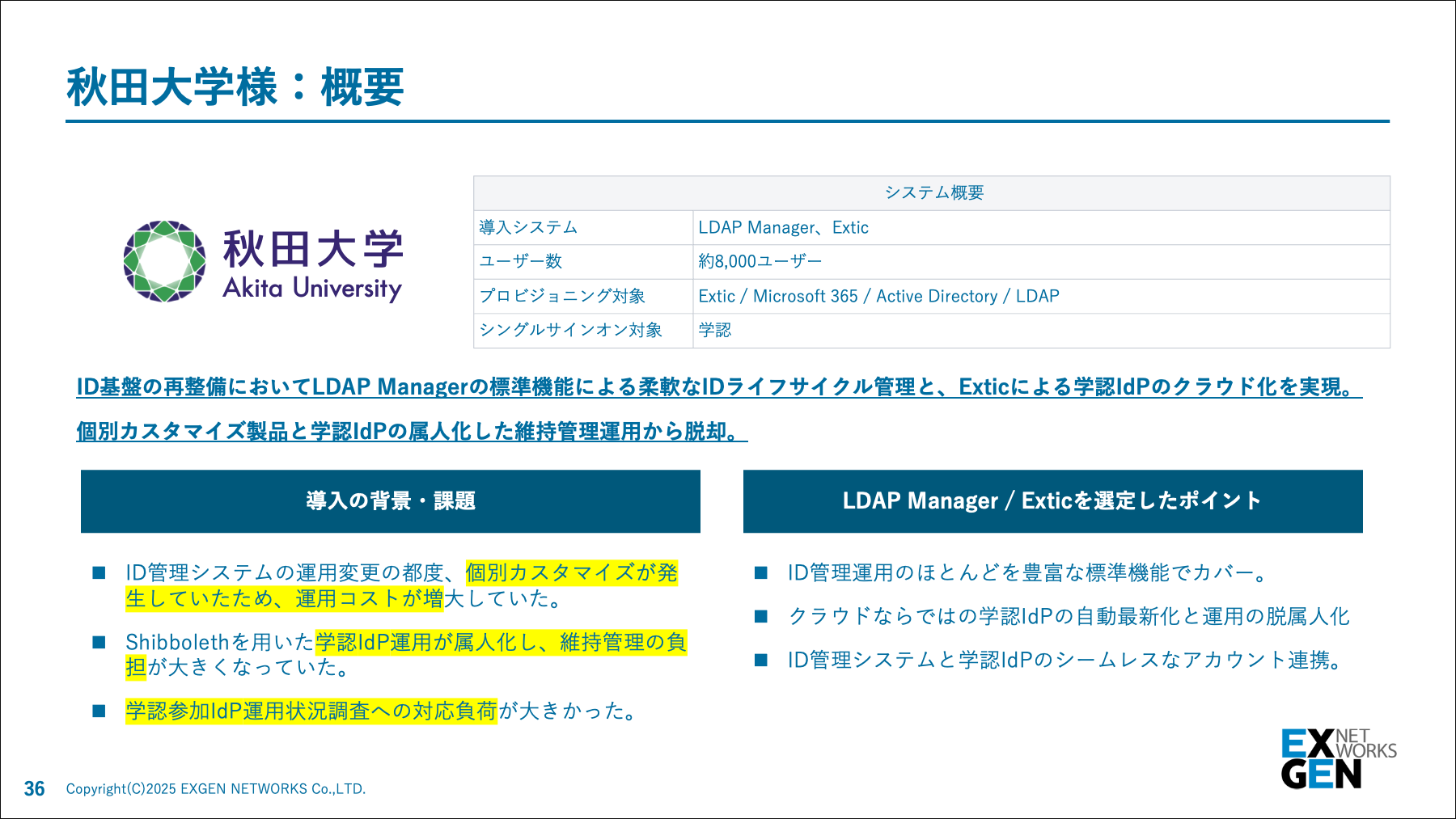 こうした課題を解決するために、LDAP ManagerおよびExticを導入しました。ID基盤を刷新したことで、従来課題となっていたIDライフサイクル管理を、柔軟かつ標準化された形で運用できる環境を実現しています。また、学認IdPの運用については、IDaaSであるExticを活用することで、運用の脱属人化にも成功しました。加えて、LDAP ManagerとExticがシームレスにアカウント連携できる点も、導入時の評価ポイントとなっています。