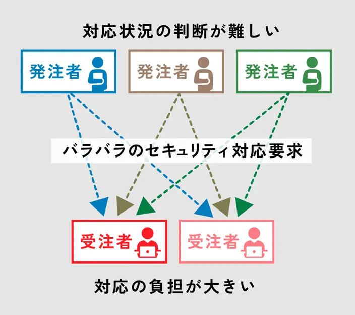 つまり、発注者にとっては対応状況の判断が難しく、受注者にとっては複数の発注者ごとにバラバラのセキュリティ対応要求に応えなければならず、その負担が大きくなっているというのです。