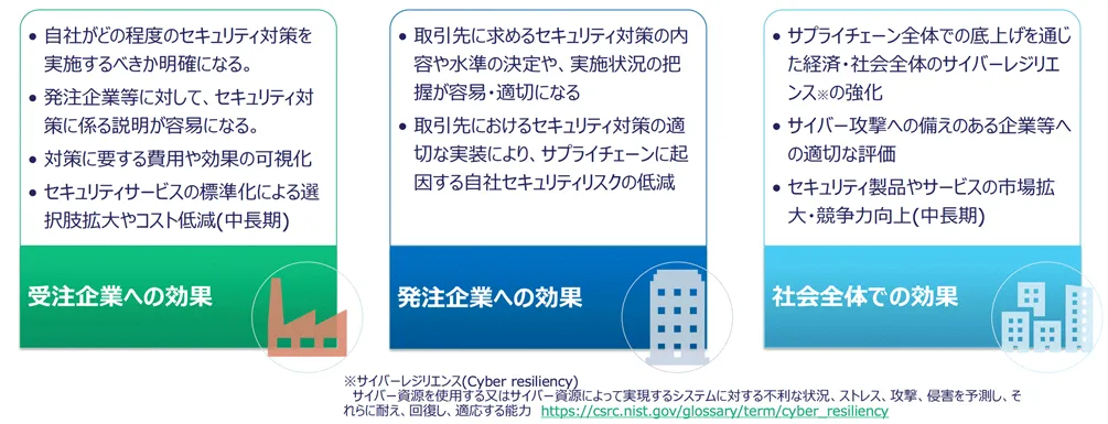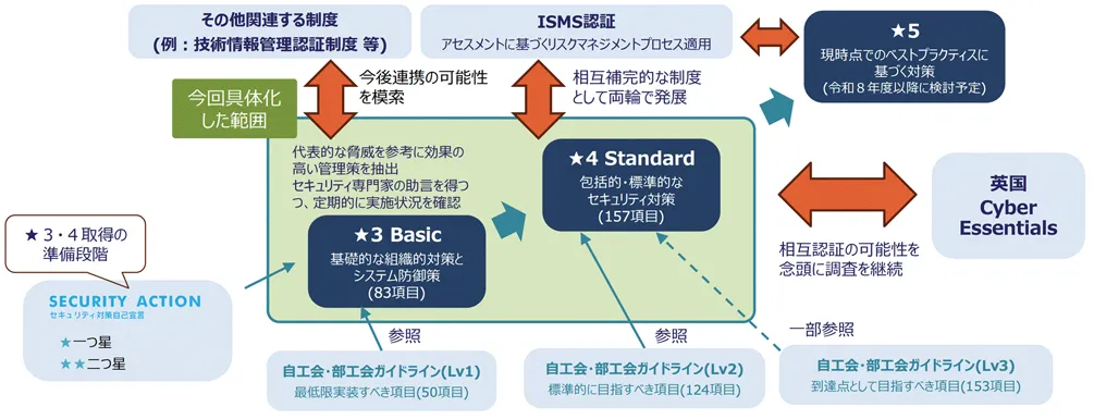 その目的は、セキュリティ対策の段階を「★」の数を用いて評価することで、発注者と受注者の双方が、適切なセキュリティ対策を行い、その対策状況を分かりやすく説明できるようにすることを目指しています。さらに、サプライチェーンにおける各企業のセキュリティ対策が適切に行われるようになることで、経済・社会全体でのサイバーレジリエンス強化も期待できるとしています。