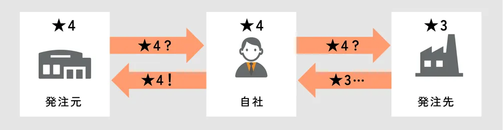 発注元(下図左)が、自社(下図中央)との取引において「★4」のセキュリティ対応を求めている場合を考えます。