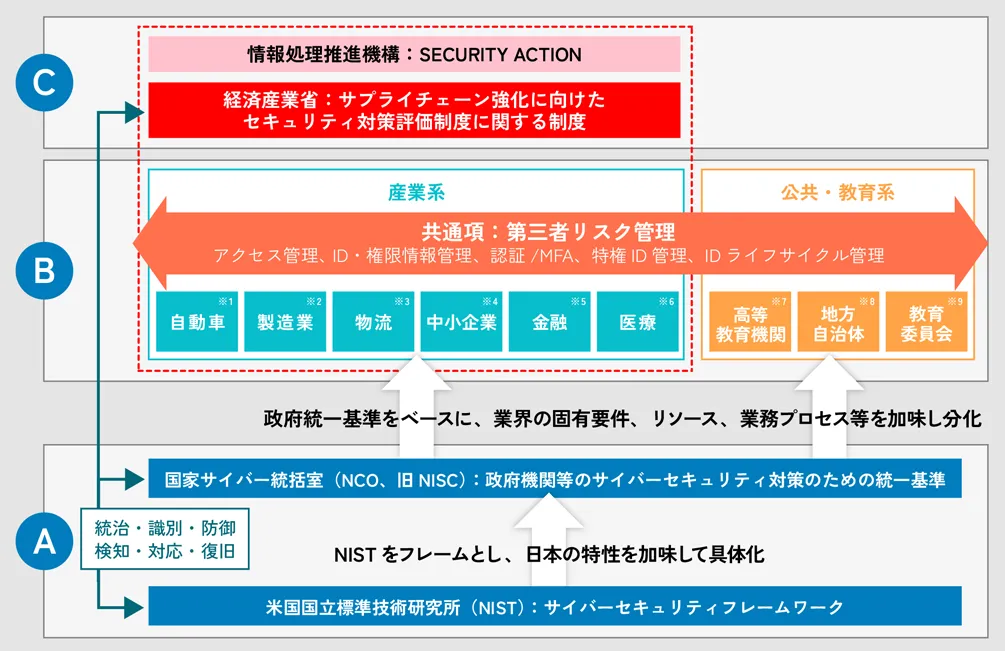 そして今、SCS評価制度は産業系の企業を中心に対応が進められようとしています。多くの企業がサプライチェーンの一角に位置することから、業種を問わずさまざまな企業で対応が求められると考えられます。また、いずれはその動きが公共・教育系へと広がっていく可能性もあり、今後もその動向は注視していく必要があります。(図のC部)