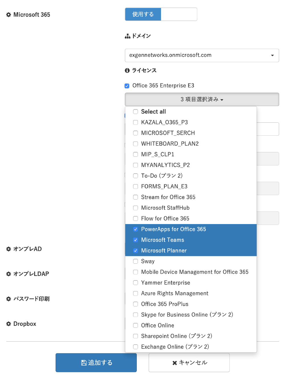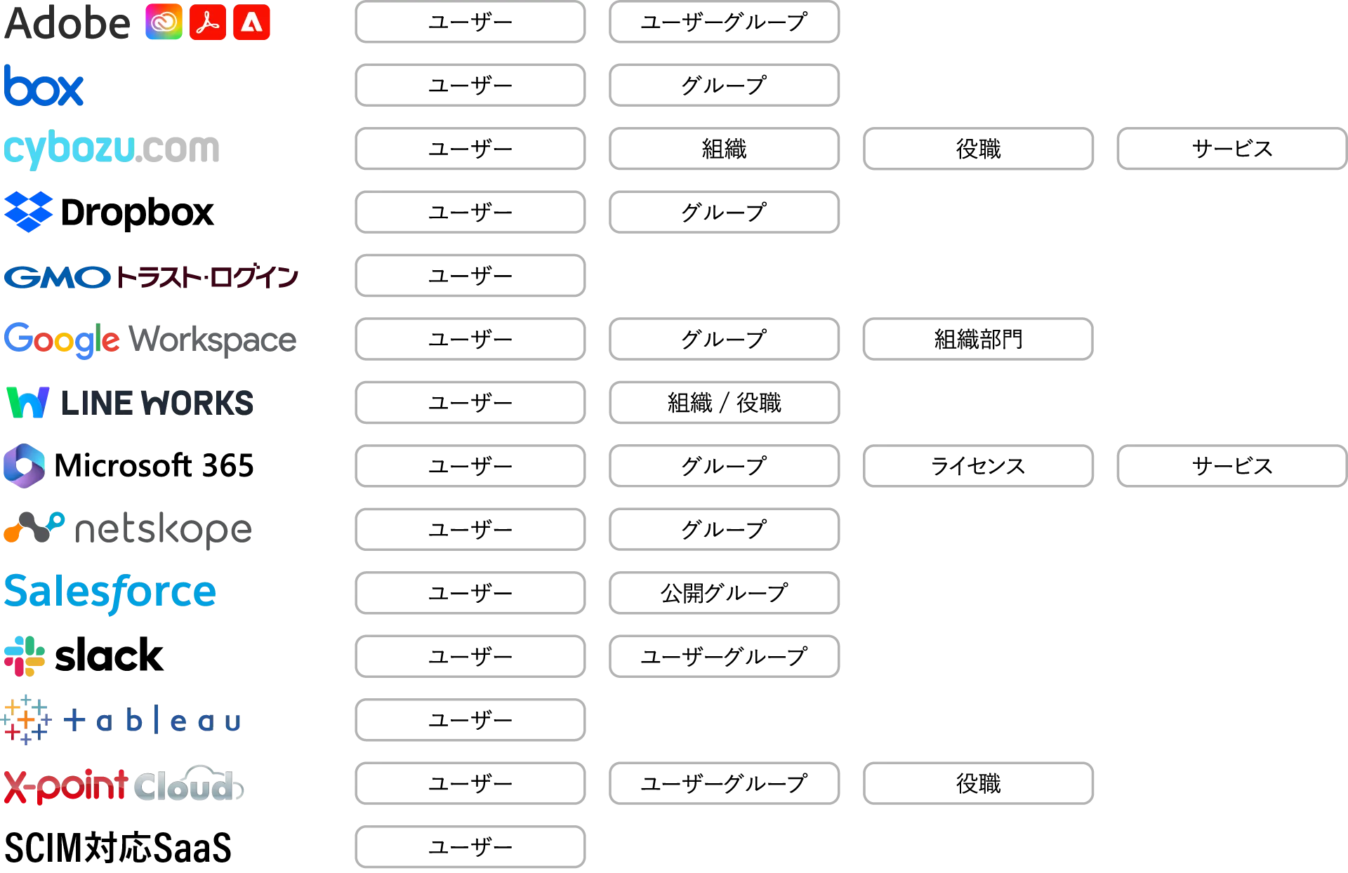 Exticは、Adobe、box、cybozu.com、Dropbox、GMOトラスト・ログイン、Google Workspace、LINE WORKS、Microsoft 365、Netskope、Salesforce、slack、Tableau Cloud、X-point Cloudへ、ユーザー情報やグループ情報を連携できます。Microsoft 365とcybozu.comに対しては、ライセンスやサービスをユーザー単位で付与・剥奪できます。SCIMによるユーザー連携も設定できます。