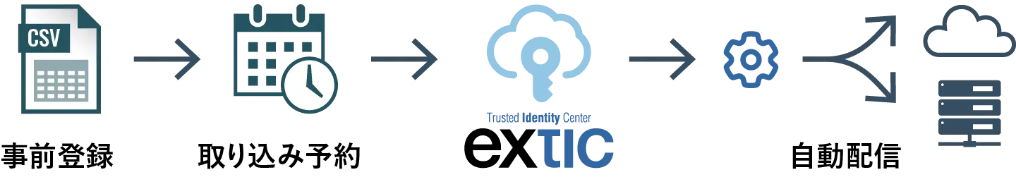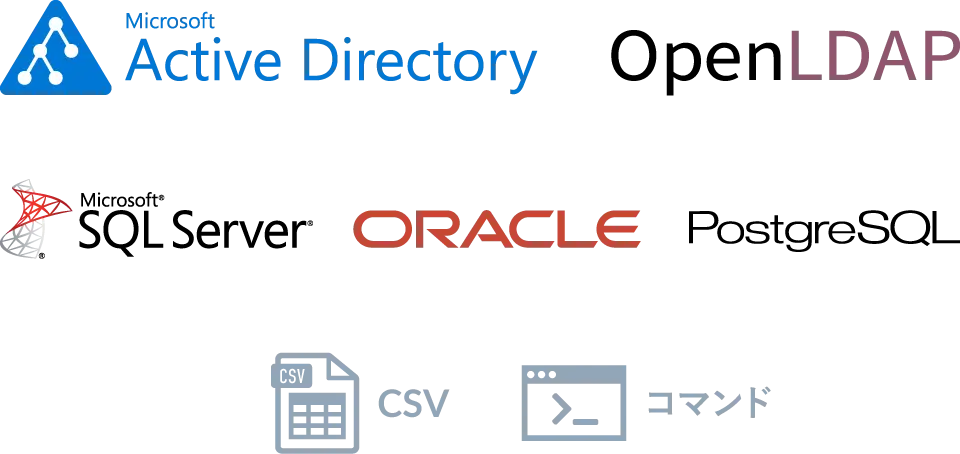 Exticは、オンプレミスのActive Directory、LDAP、データベース、CSVにもユーザー情報やグループ情報を連携・出力できます。また、Exticが管理するユーザー情報を引数として、任意のコマンドやスクリプトを実行できます。これらの機能により、オンプレミスで稼働するアプリケーションのユーザー情報も、Exticでまとめて管理できます。