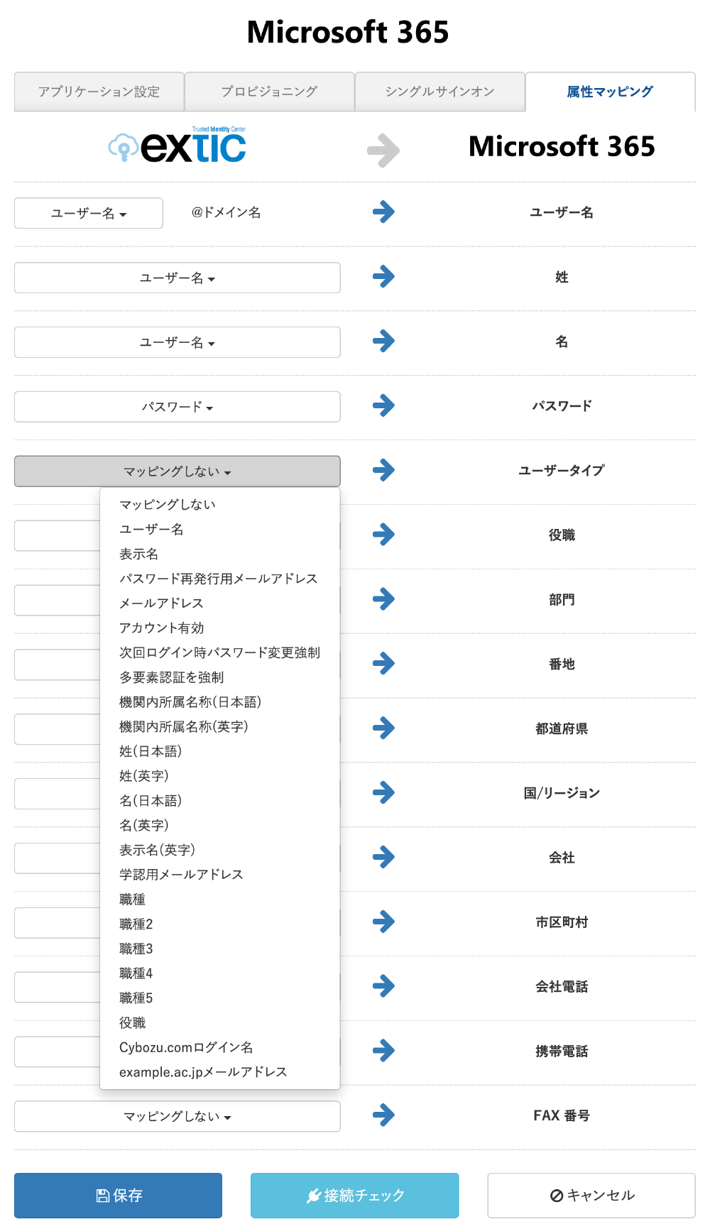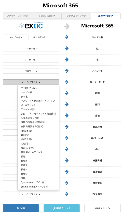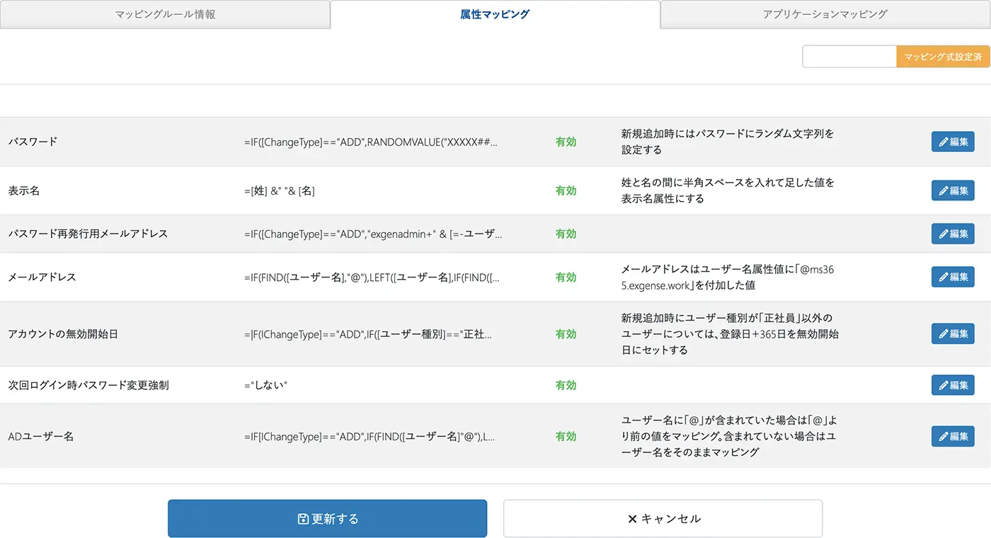 オンプレミスへの連携時には、Exticのユーザー情報を連携先に合わせて加工するマッピング関数が利用できます。 約40のマッピング関数により、お客様の環境に合わせたきめ細かなユーザー情報の連携を設定できます。