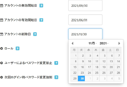 IDの「有効開始日」「無効開始日」「削除日」を事前に設定できます。
