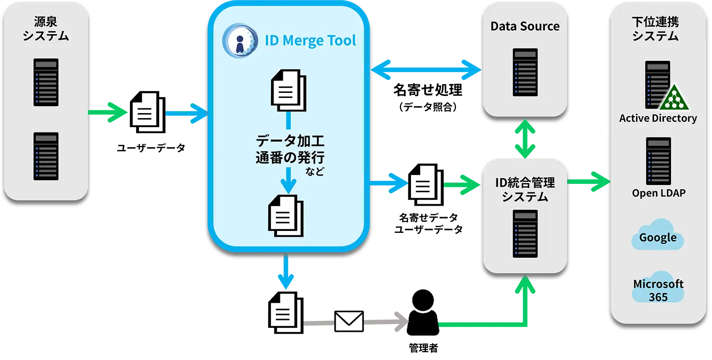 LDAP Managerと連携しID重複を防止。情報を正しく整理し、一元管理で運用負荷を軽減します。 LDAP Managerと連携し、新規データと既存情報の重複を防止。柔軟なルール設定により散在する情報を正しく整理できます。手作業やアカウントの多重発行による無駄をなくし、一元管理で運用負荷を減らします。